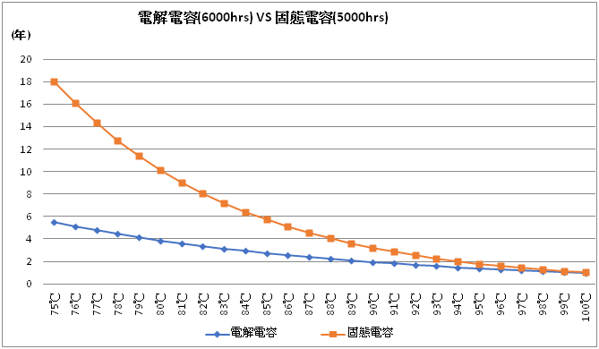 表二是两者的寿命比较。以6000hrs/105℃的液态电解电容与5000hrs/105℃的固态电容来做比较,图三是根据公式计算出不同温度下的寿命;由曲线图可以知道,在高温下,固态电容并无法展现出高寿命的特质,而在90℃以下,此特质才会越明显。
